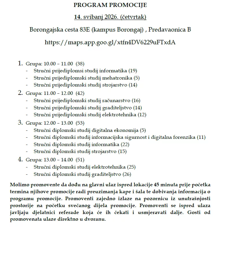 Poštovani studenti, Slijedeća promocija diplomiranih studenata održati će se 14.05.2026. u prostorima Tehničkog veleučilišta u Zagrebu na Kampusu Borongaj. Točan raspored po grupama za promociju biti će objavljen sredinom travnja.