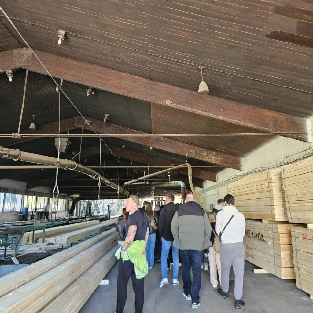 U sklopu posjeta obišli su tvornicu drvenih elemenata u Voćinu, gdje su se upoznali s procesom proizvodnje drvenih i lameliranih elemenata, te halu–skladište kukuruza čija je krovna konstrukcija izvedena od lameliranih drvenih nosača.